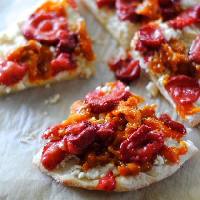 top the baked and cooled (or hot, your preference) pizzas with 1/4 cup ricotta each. Then add cooled summer fruit. Eat immediately.