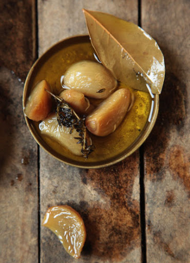 *Heat* oil and garlic in small saucepan over medium-low heat and cook over very low heat until soft, about 1 hour (do not brown). *When soft*, remove to a glass jar, cover with the oil and refrigerate.