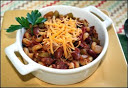 Once both are cooked, add drained pasta to the pot of chili. Mix thoroughly. Season to taste with cayenne pepper and additional spices, if you like. Evenly top each serving with cheese and enjoy!