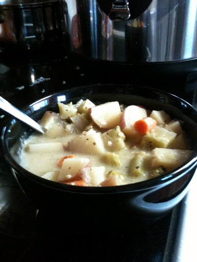Place the potatoes, onion, carrot and garlic in a 4 or 5 quart slow cooker. Add the water, soup and seasonings. Cover and cook on low for 4-5 hours or until heated through.