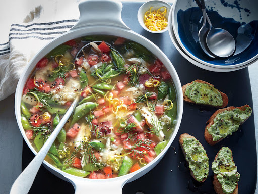 This bright, vegetable-laden chicken soup is a reminder of warm spring days to come, but comforting enough to soothe on a cold night. Quinoa cooks right in the soup without soaking up too much liquid. If you’d like to change to a heartier grain like farro or barley, cook it separately and stir in during the last 5 minutes of simmering to reheat. You could also use any combination of delicate green vegetables, such as snow peas, spinach, or even frozen green peas or edamame. Stir in a little fresh lemon juice for an extra dose of brightness before serving.