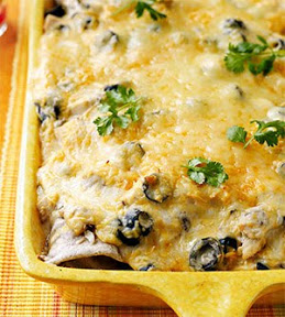 4. In a medium-size bowl, mix together milk, soup, 1 cup of the cheese and the olives. Pour mixture evenly over the chicken and burritos. Top with remaining 1/2 cup cheese.