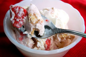 Pour ice cream base into ice cream maker, and process according to manufacturer's direction. In the last 5 minutes of processing, add graham cracker-cream cheese chunks (breaking up the mixture using your fingers) and strawberry mixture to ice cream, and allow to finish churning.