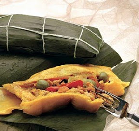 Ahora bien, primero va a tomar una hoja de las más grande y la engrasa con un poquito de manteca onotada, coloque en el centro de la hoja una bola de masa y adelgácela con los dedos, creando una circunferencia simétrica, luego agregue el guiso ya frío y sobre éste coloque los adornos distribuidos armoniosamente. Luego doble por la parte ancha de la hoja, creando un pliegue hasta que quede cerrado, doble los extremos hacia dentro y envuélvala con la hoja más pequeña, luego tome la tira de hoja y asegure la hallaca por el medio, amárrela con pabilo cruzándola dos veces en cada dirección.