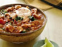 Add the tomato mixture to the pork and simmer until the meat is tender, about 30 minutes. Add the greens and cook 10 more minutes. Season with salt. Ladle the chili into bowls; top with the pumpkin cream and more chili powder. Serve with lime wedges.