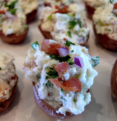 Scoop out the center of each potato half and place in a medium bowl. Stir in the sour cream, blue cheese, bacon, parsley and onion. Fill each potato skin with the sour cream mixture and top with more bacon, onion and parsley. Serve immediately or chill and serve later.