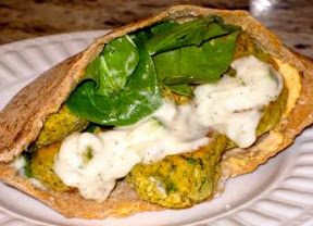 Form the falafel mixture into golf ball-sized balls. Flatten the tops a bit & place them on the cookie sheet. Bake for 12 minutes, flip, and continue baking for 5-8 minutes until both sides are beautifully golden brown. Serve inside a slightly warmed pita with spinach, cucumber, the hummus of your choice and/or Vegan Tahini Tzatziki Sauce (recipe below).