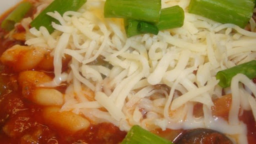 "If you enjoy pizza, you will love this spicy pizza soup topped with mozzarella cheese. Include black olives, if desired."