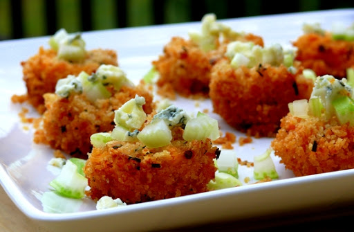 Bake hot wing cakes until golden on top and set, about 20 minutes. Cool in pan 15 minutes, do not rush this, they will fall apart if you try to move them too soon. Gently lift each crab cake out of the pan with a small fork onto a serving platter. Sprinkle with the last 4 ounces of blue cheese and diced celery.