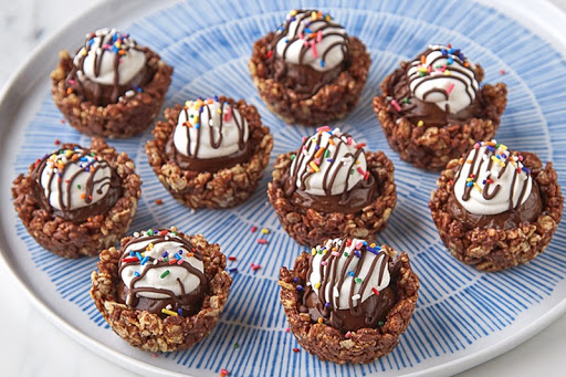 Use moistened hands to press cereal mixture onto bottoms and 3/4 the way up sides of 10 muffin pan cups sprayed with cooking spray.