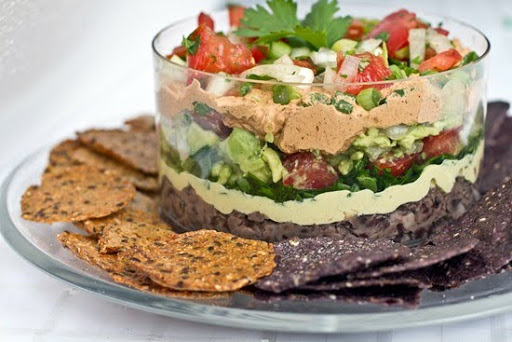 The perfect tortilla chip dip for your next get together! Fresh Mexican 7 Layer Dip features a bean puree, spinach, cheese, guacamole, sour cream and salsa.