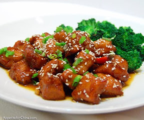6. Return the chicken to wok and stir well to coat with sauce. Transfer the chicken to serving dish. Garnish with white sesame and scallions. Serve with white rice and vegetables.