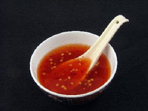 Authentic Vietnamese Cooking, Food from a Family Table, By Corinne Trang, Simon & Schuster, December 1999, Hardback, 256 pages, more then 50 black & white photographs, Glossary of ingredients ISBN: 0-684-86444-4. A meal without Nuoc Cham is no meal at all. Served as a dipping sauce with many dishes such as cha gio, spring rolls; Banh Xeo, sizzling "sound" crepes; and grilled meats and seafood; it is perhaps the most important sauce you will learn to make. There are several variations on this recipe. If you like your sauce spicier, mince rather than slice the chilies and garlic. Sometimes distilled rice wine vinegar is used to round out the flavor. My aunt Loan likes to slice and add shallots, saying they make the sauce sweeter. Try it different ways, mild or hot, more sweet or sour, with or without shallots. All are interesting. Preceding is my favorite version, which balances the sweet, sour, and spicy levels. I suggest you make 2 cups, as it goes quickly. Any left over can be refrigerated for up to 2 weeks.