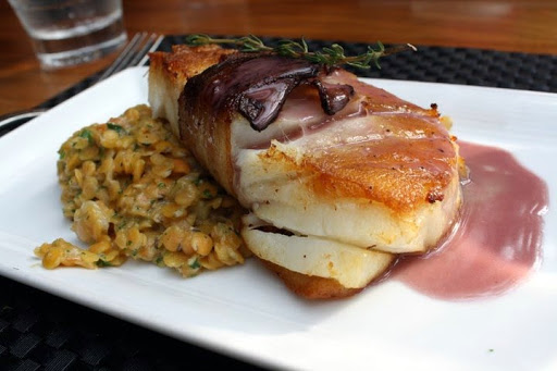 Apple Bacon Sea Bass, Wrapped on Lentils du Puv