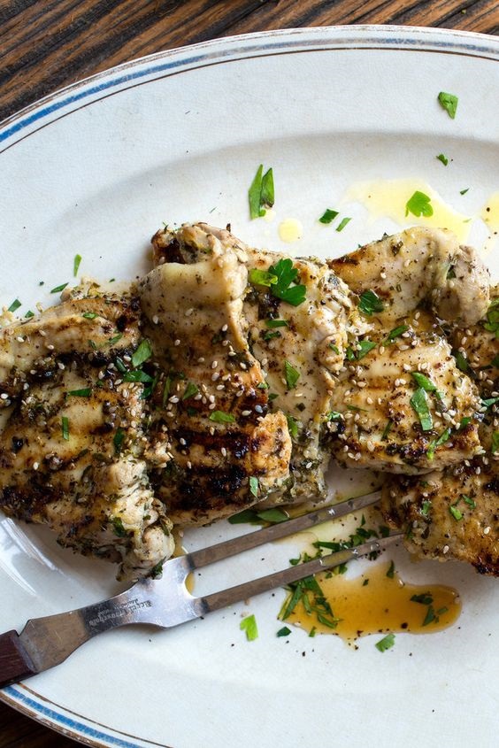 Combine chicken with all but 1 teaspoon of the grated garlic (save that teaspoon for the yogurt sauce), the zest and juice of 1 lemon, oil, parsley, mint, thyme, oregano, 1 1/2 teaspoons salt, and the sesame seeds and sumac, if using. Cover and marinate for 15 to 30 minutes at room temperature; you can refrigerate it for up to 24 hours.