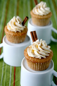 Fill a pastry bag with the frosting and decorate the cooled cupcakes as desired. (I used a large, unlabeled star tip for these cupcakes). Sprinkle with ground cinnamon or grated nutmeg, and garnish with cinnamon sticks if desired.