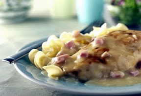 2.Stir the soup, water, wine, cheese and ham in the skillet and heat to a boil. Reduce the heat to low. Cover and cook for 5 minutes or until the chicken is cooked through. Serve the chicken and sauce with the noodles.