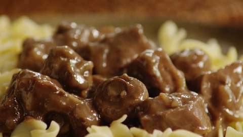 Heat oil on high in a dutch oven. Saute onions 5 minutes with salt. Add meat, season with garlic & pepper, brown for 10 minutes. Pour water (or until beef is just covered), soy sauce, and Worcestershire sauce into the pot. Bring to a boil. Reduce heat and simmer 1 - 1 1/2 hours. Combine gravy mix with 1/2 cup of stock from the pot. Mix in pot and boil until thick. Add 1 tsp of cornstarch if desired, or boil gravy before adding to thicken. Serve with rice or egg noodles.