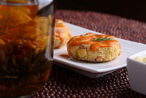 When you are ready to make the crab cakes, place the corn flour into a shallow wide bowl. Place a pan (preferably cast iron) over medium heat for about 3 minutes.