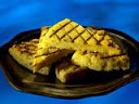 When ready to grill, or pan fry, remove the polenta from the pan and cut it into equal pie shapes or cut circles with a biscuit cutter. Lightly oil a grill, brush each side of the polenta with olive oil and grill or pan sear until golden brown, about 3 minutes on each side. Arrange the polenta on a serving platter and serve hot.