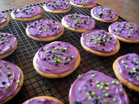 2.) Roll dough out on a heavily floured surface to a 1/4 inch thickness. Cut with a 3-inch cookie cutter. Place on lightly greased baking sheets. Bake at 350º for 10-12 mins. or until cookie springs back when lightly touched. Cool. Mix all frosting ingredients until smooth; spread over cookies. Decorate with sprinkles or colored sugar.