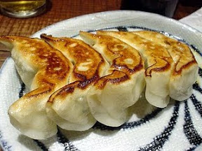 Pinte los bordes con un poco de agua, dóblelos para juntarlos en el medio y presiónelos para sellarlos. Pinte los extremos curvados con un poco más de agua y haga unos pequeños pliegues en la juntura. Repita el proceso con el resto de las láminas de masa y de relleno, hasta obtener 24 gyozas. Caliente un poco de aceite en una sartén con tapa y ponga las empanadillas que quepan, dejando un poco de espacio entre ellas. Fríalas 2 minutos o hasta que estén doradas por la parte inferior. Añada 3 mm agua, tape la sartén y deje cocer las empanadillas a fuego suave unos 6 minutos o hasta que estén cocidas y transparentes. Destape la sartén y suba el fuego para que se consuma el agua. Retire las gyozas de la sartén y resérvelas calientes mientras prepara las demás. Mezcle en un bol los ingredientes de la salsa y sírvala con las gyoza.