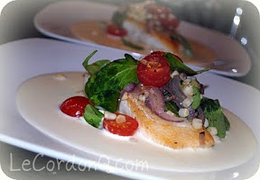 For the Salad: In a frying pan, saute 1/2 of the corn and the red onion in olive oil until soft, but not soggy. Place in a bowl and allow to cool. Add the cherry tomatoes and arugula and toss. Add olive oil, salt and pepper, to taste. Set aside.