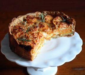 3. Layer one-third each of Yukon gold potatoes, sweet potatoes, and salt in prepared crust. Sprinkle with 1/4 cup cheese. Repeat layers twice, pressing layers down slightly to fit.