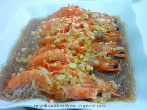 4)把冷却后的姜蒜酱淋在虾上,加入7汤匙清水。