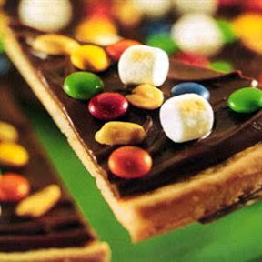 * MELT chocolate chips with sweetened condensed milk in medium-sized saucepan over low heat. Spread over crust. Sprinkle with milk chocolate candies, marshmallows and peanuts.