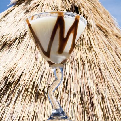 Strain into striped martini glass. Shake espresso shot in shaker with ice and strain into center of martini.