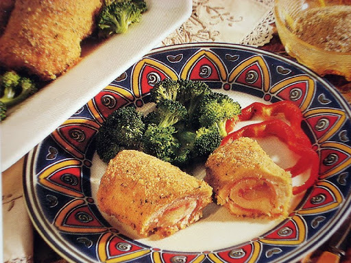 Melt butter in a baking dish in the oven. Dip chicken rolls in butter and roll in bread crumbs to coat.