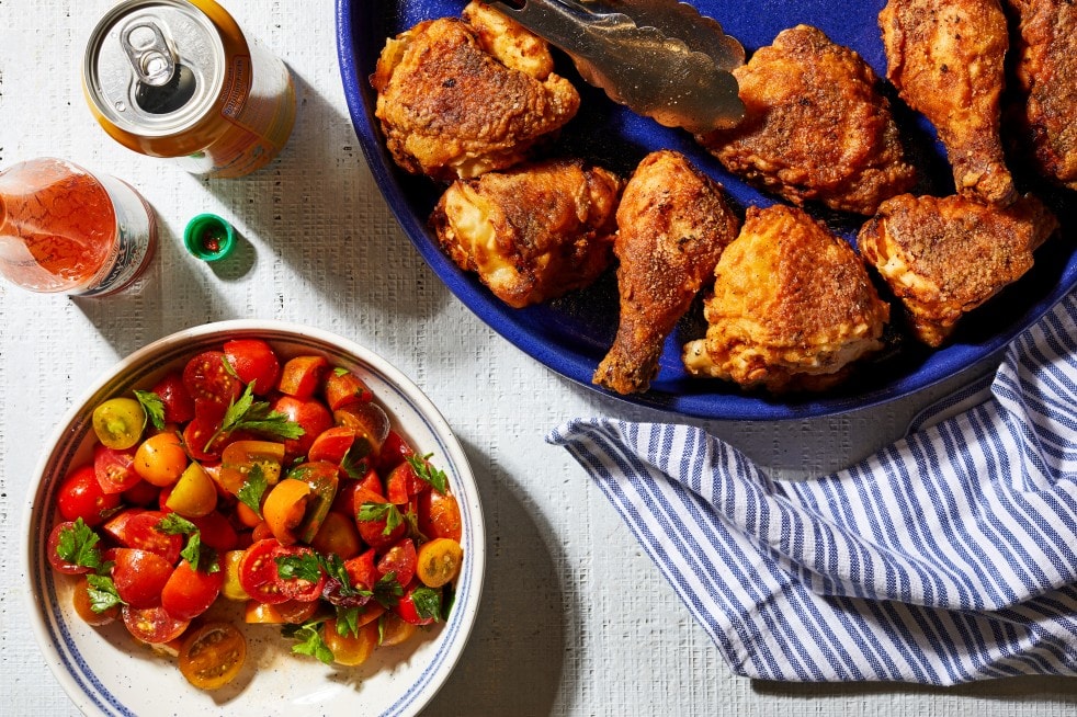 The chicken is done when evenly browned and crisped; an instant-read thermometer inserted into the meat (and away from the bone) should register at least 165 degrees. Use tongs to transfer it to a clean wire rack to drain and cool for a bit before serving.