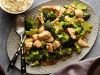 Get the skillet good and hot again, and then heat 2 more tablespoons oil. Add the chicken and chili flakes if using. Stir-fry until the chicken loses its raw color and gets a little brown, about 3 minutes. Add the hoisin sauce, return the broccoli to the pan and toss to heat through. Stir in the reserved cornstarch mixture and bring to a boil to thicken. Add more water if need to thin the sauce, if necessary. Taste and season with salt and pepper, if you like. Mound the stir-fry on a serving platter or divide among 4 plates and garnish with sesame seeds; serve with rice.