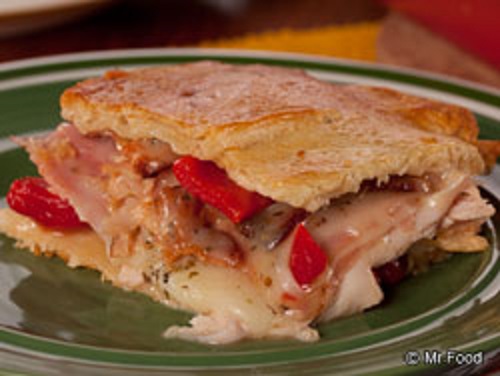 Layer with half the turkey, half the ham, and all the bacon. Continue layering with half the provolone cheese, half the roasted peppers, and 1/2 teaspoon Italian seasoning. Repeat with remaining meats, cheese, peppers, and Italian seasoning. Place remaining square of dough on top. Brush with beaten egg.