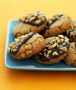 3. Ganache: Microwave cream in glass bowl on high 1 minute or until it just begins to simmer. Add chocolate chips; let stand 2 minutes. Stir until chocolate is melted and smooth; spread over half of cookie top and sprinkle with chopped peanuts. If ganache begins to firm up, microwave a few seconds at a time until easy to spread. Let set at room temperature.