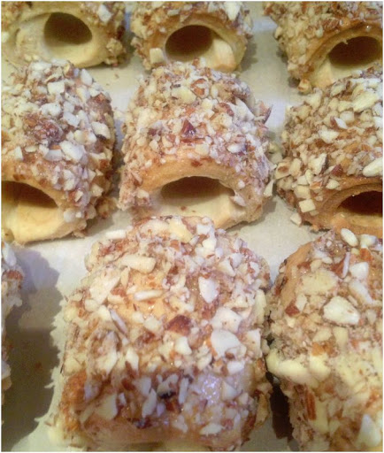Roll out to 1/4 inch. Cut into squares 2 inches by 4 inches, wrap around canoli forms. (brush milk on end to “stick” together)