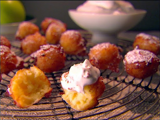 Using a small ice-cream scooper or 2 small spoons, carefully drop about a rounded tablespoon of the dough into the hot olive oil. Turn the zeppole once or twice, and cook until golden and puffed up, about 4 minutes. Fry the zeppole in batches so as not to overcrowd the pan. Drain on paper towels. Transfer the zeppole to a serving dish and sprinkle with powdered sugar using a small sieve. Serve with the cinnamon whipped cream alongside for dipping.
