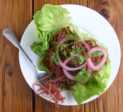 Puree the dressing ingredients in a blender. Mix the dressing into the shredded beef. It’s best to make this recipe ahead and refrigerate for at least an hour (overnight is even better) to let the flavors meld—just reheat when ready.