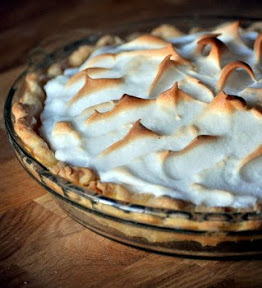 Spoon meringue onto pie filling and make sure to completely seal the edges with the crust, leaving no filling exposed.