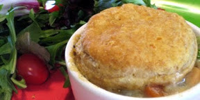 3.Fill ramekins with warm chicken mixture and top with biscuit. Brush tops of biscuit with remaining melted butter. Bake for 13 to 15 minutes, until filling bubbles and biscuits are puffed up a golden brown. Let stand for 5 minutes before serving. They’re very hot!