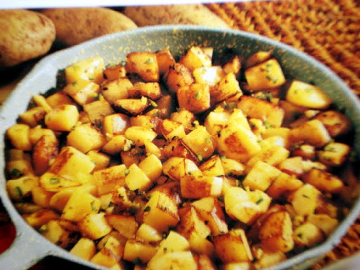 Peel potatoes and cut into 1/2-inch cubes. Finely chop onion and green pepper