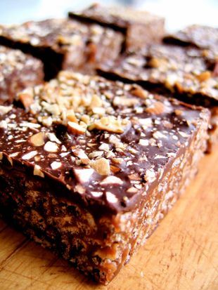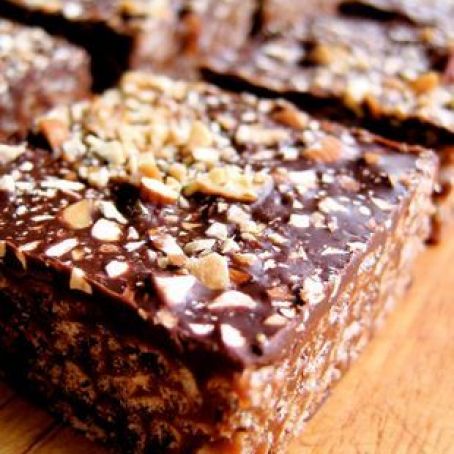 A few notes: You can use corn syrup or golden syrup in place of the rice syrup if you prefer. Barbara's Bakery Crisp Brown Rice Cereal stays the crispiest of the four different brands I've tried. Chocophiles may want to double the ganache topping and sprinkle the top with cacao nibs. Forget the traditional rice cereal treats with marshmallows -- these Hippie Crispie Treats are wonderful. Once you assemble the ingredients (rice syrup was new to my kitchen pantry), it all comes together easily. Setting the ganache in the fridge is essential; the treats remained crispy in my fridge for several days. I would make the salt & almonds on top optional. I’m adding dried cranberries to the next batch! This recipe is a family favorite already.
