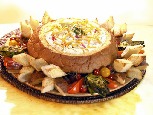 Carefully hollow one loaf, leaving one inch on sides and bottom. Cube removed Bread and additional loaf. Mix next five ingredients until smooth. Fold in artichoke hearts and crab. Warm the mixture in microwave or stovetop. Remove from heat. Mix 4 oz. cheddar cheese into mixture, then pour into hollowed loaf. Garnish with remaining cheddar. Arrange bread cubes around loaf when ready to serve. Serve warm or cold.