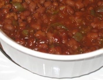 In a large saucepan, fry the bacon over medium heat for 3 to 4 minutes. Then add the onions and cook until the bacon is cooked but not crisp and the onions are translucent, another couple of minutes. Do not drain the bacon grease because it gives the beans a good taste. Add the beans, peppers, tomatoes, garlic and 1 1/2 cups water, and cook for 10 to 15 minutes. Add some salt and pepper and the cilantro and remove from the heat.