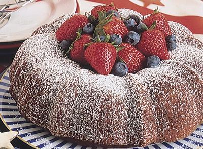 3 Bake 45 to 50 minutes or until wooden pick inserted comes out clean. Cool 10 minutes; remove from pan to wire rack. Cool completely. Place cake on serving plate. Sift powdered sugar on top and sides of cake. Serve with blueberries, strawberries and whipped cream , if desired. 12 to 16 servings.