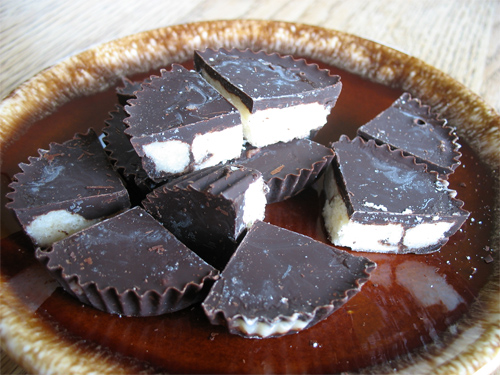 Pinch off bits of the coconut/mint mixture and divide between the sections, filling them nearly to the top (this works better if the mixture has cooled enough to be thick, and you can put a little ball of it into each mold).