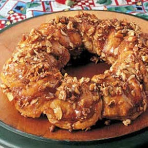 Separate biscuits; place in prepared pan with edges overlapping. Top with remaining syrup and nut mixtures. Bake at 375° for 15 minutes or until golden brown. Cool for 1-2 minutes; invert onto a serving platter. Serve warm. Yield: 10 servings.