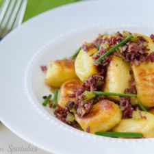 Add the potato gnocchi to the boiling water and cook according to package directions. As the gnocchi float to the top, scoop them out with a slotted spoon, allowing any water to drain off. Drop them into the pan with the butter. Once all of the gnocchi are in the pan, turn up the heat and cook, stirring and flipping until they are golden brown. Scoop them out onto some kitchen toweling and keep warm.