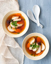 With a slotted spoon, transfer the chicken, carrots, and star anise to large shallow bowls. Strain the broth and add the minced ginger and 2 tablespoons of the chopped scallion. Ladle the broth over the chicken and top with the remaining chopped scallion.